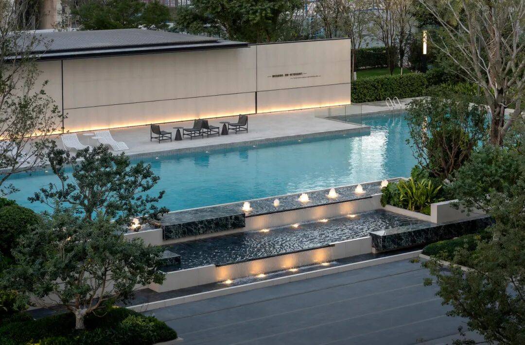 主入口轴线对景设置叠水水景,以灵动水景呼应轴线仪式感,与泳池景观形成呼应,让归家动线从入口到亲水空间,皆有景致串联、层次递进。