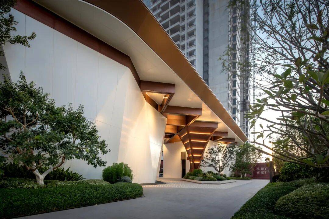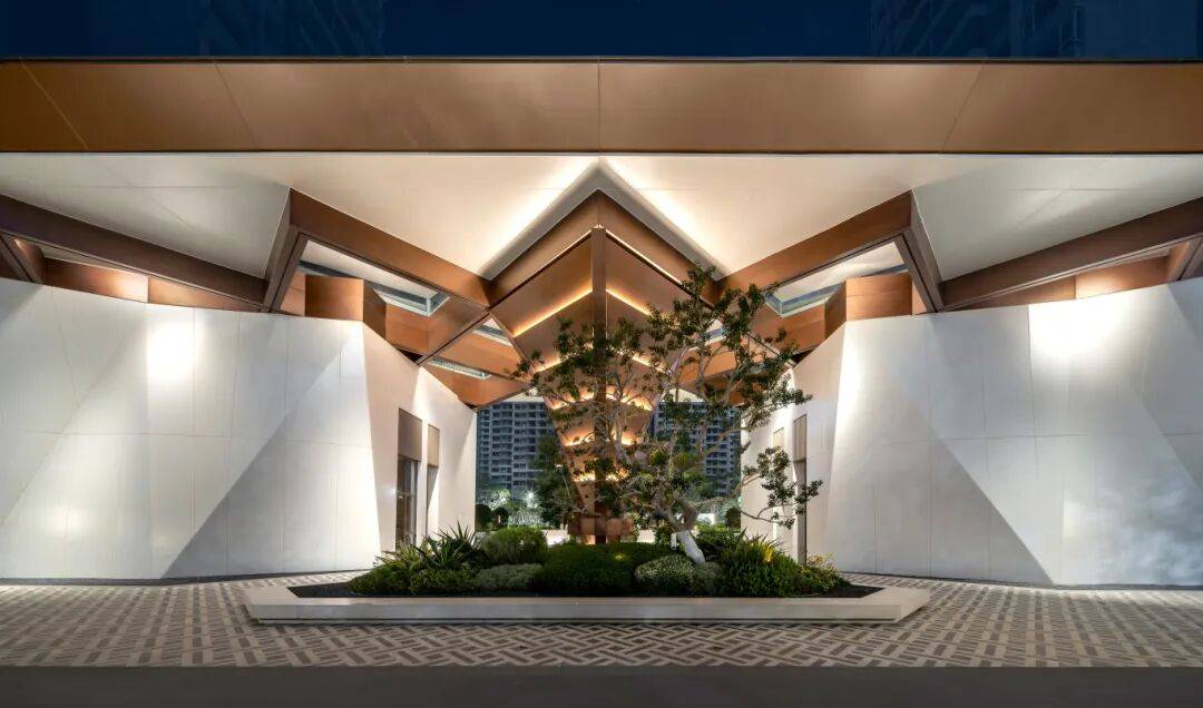 社区主入口以 80m 酒店式艺术定制门户形象,打造顶级视觉入口 —— 萃取爱马仕高级白金配色、融入珠宝切割划线设计,我们以精研的尺度把控、层次递进的景观序列,凝练出克制而不失格调的仪式感与尊崇感。
