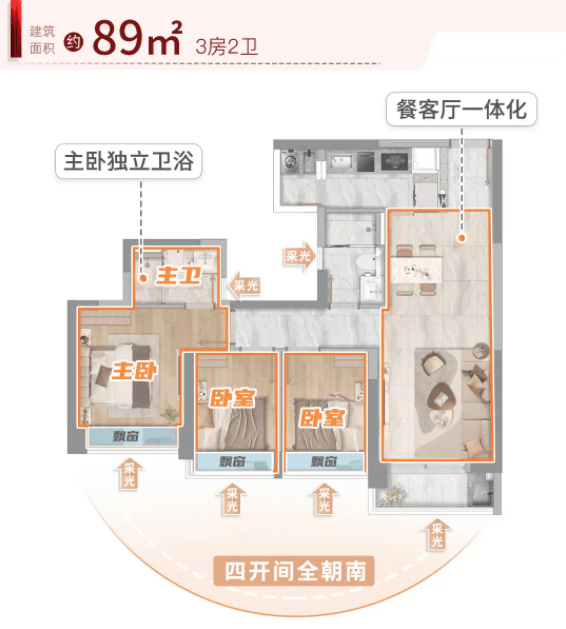 随着家庭人口的增加和生活品质的提升,人们对居住空间的需求也在不断升级。新世界天馥敏锐地捕捉到了这一变化,推出了89㎡三房两卫和98㎡四房两卫两款进阶户型,满足了改善型客户的需求。89㎡三房两卫户型,采用了经典的三开间朝南设计,保证了主要生活空间的采光和通风。三个房间均带有飘窗,不仅扩大了视觉效果,还增加了实用面积。主卧配备了独立卫生间,提升了居住的私密性和舒适度。U型厨房设计合理,收纳空间充足,满足了烹饪爱好者的需求。客厅与阳台相连,形成了一个宽敞的休闲区域,适合家人聚会、孩子玩耍。这款户型总价约347万元起,性价比极高,是三口之家或二胎家庭的理想选择。