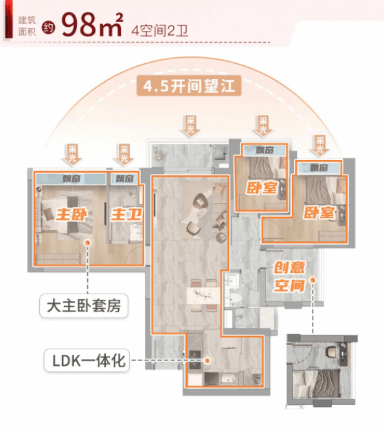 98㎡四房两卫户型,则被称为“全能户型”。在百平以内做到四房设计,实属罕见。这款户型不仅空间利用率高,而且功能分区明确。主卧套房设计,私密性强,部分户型还能俯瞰江景,视野绝佳。三个次卧灵活多变,可以作为儿童房、老人房、书房或客房使用,满足了家庭成长的多种需求。客厅面宽较大,采光极佳,营造出大气的居住氛围。总价约382万元起,即可拥有这样一套功能完备的四房,对于追求高性价比的改善客户来说,极具吸引力。
