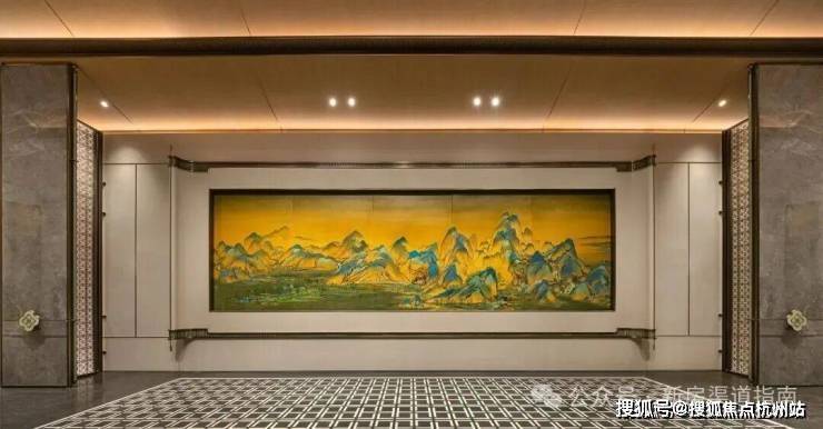 入门处《蓬莱仙境》非遗漆画与西门《千里江山图》遥相呼应,藏风聚气,寓意基业长青