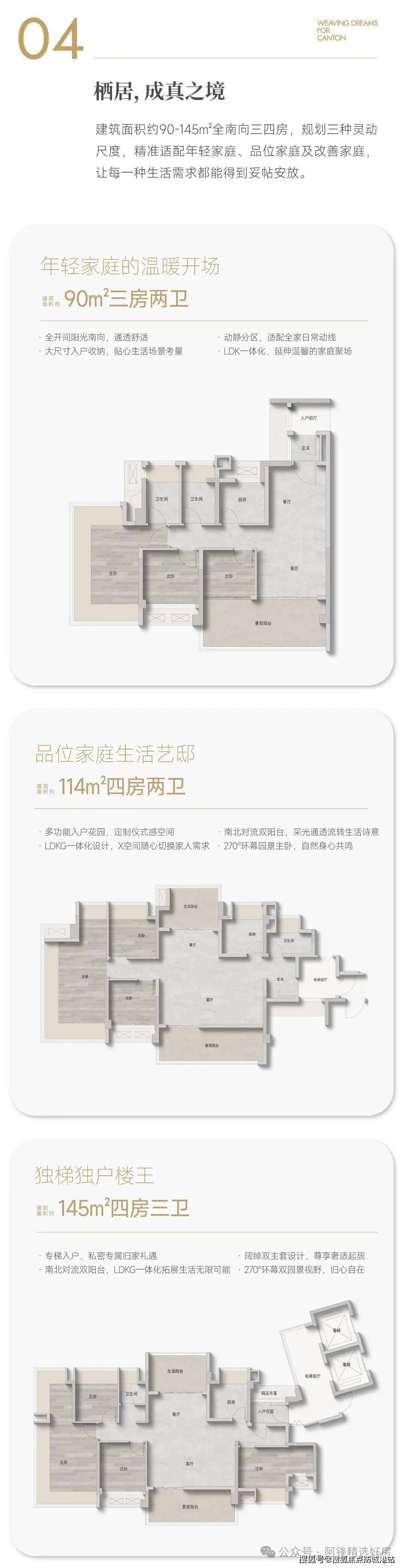 A:项目主打90㎡三房、114㎡四房、144㎡四房三种户型,满足不同家庭的需求。