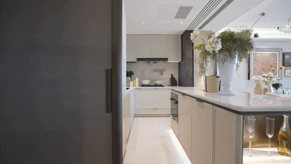 交付独立岛台(这是以往180㎡以上大平层才有的待遇),收纳空间惊人(边套约20.04m³,中间套约16.56m³),搭配顶豪级装修(全套嘉格纳厨房、大金厨房专用空调、杜拉维特卫浴),还有三大柔性定制(艺术家联名定制入户门把手、艺术门牌挂画、墙面饰面&岛台多款石材/岩板可选)。