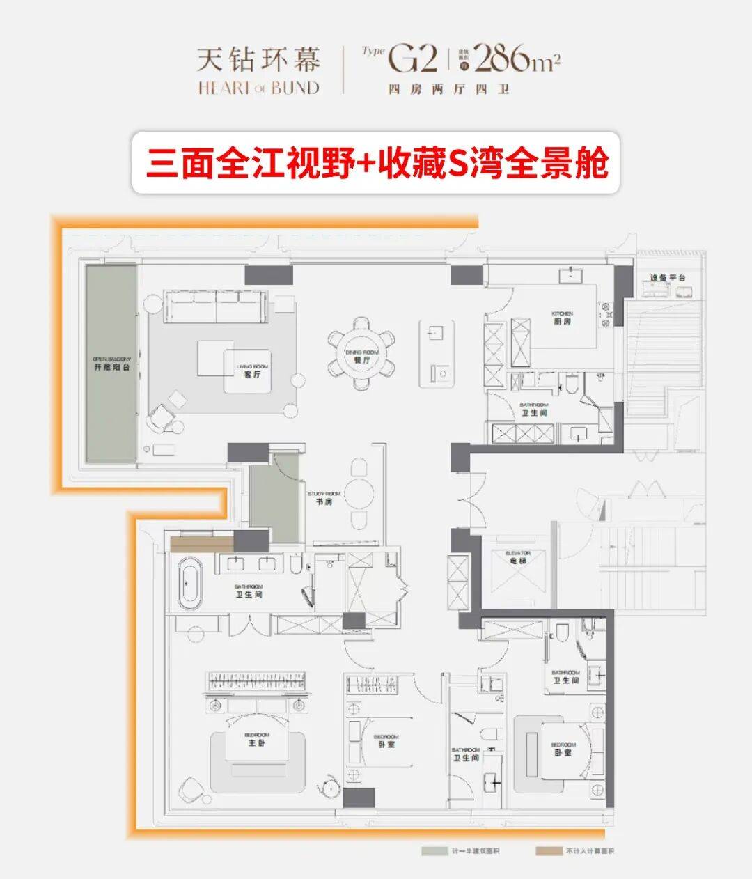 创新蝴蝶布局+真三面视野+超大全景画框+全套房设计。直面S湾,三面看江,纵享S湾全景舱360°寰视江景巨幕。