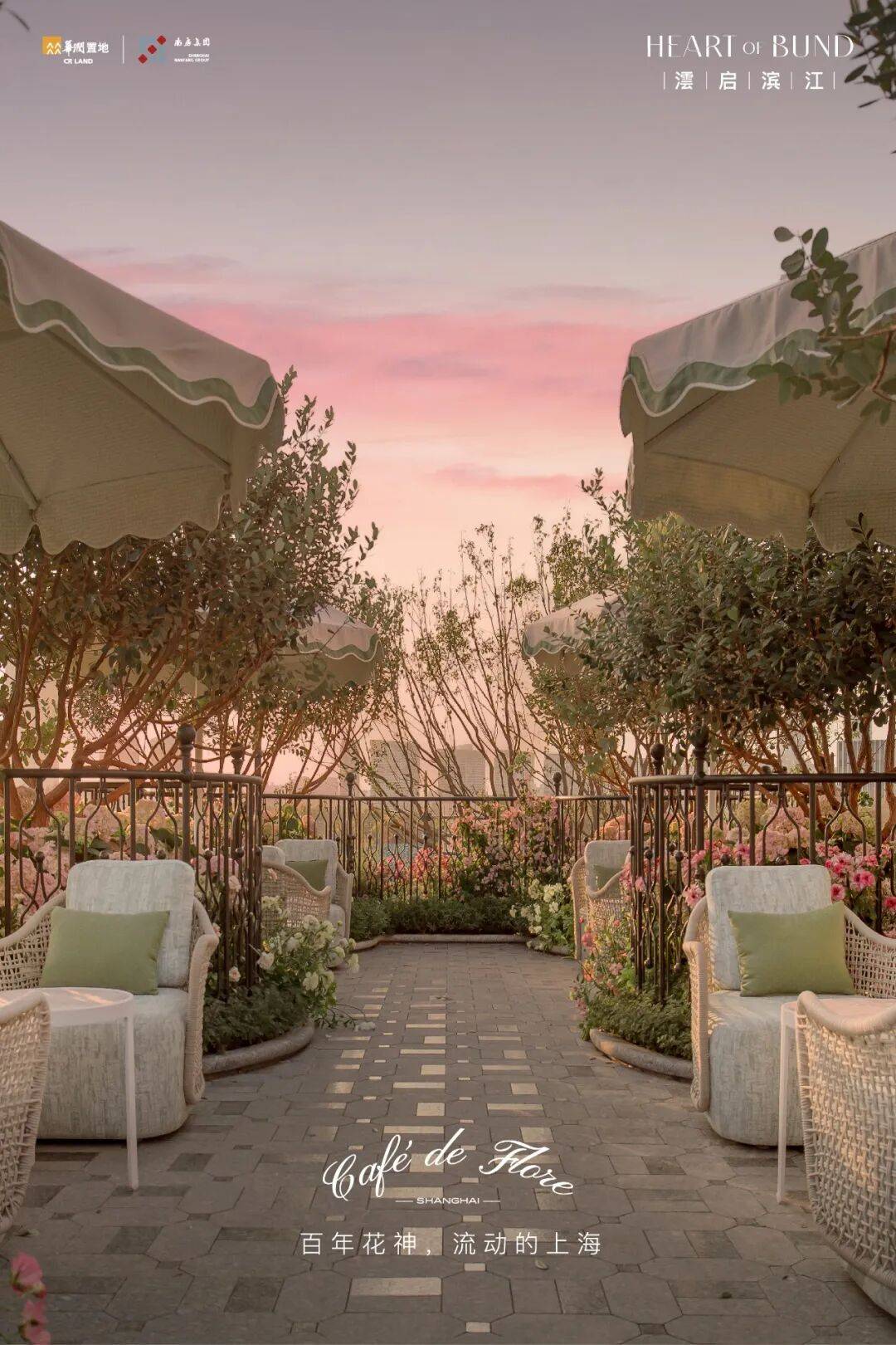 坐在这里,近处是花团锦簇,远处是上海历时20年雕琢而成的壮丽滨江天际线。