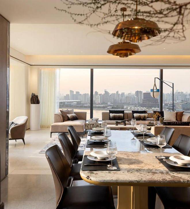 客餐厨顺势衔接、浑然一体,无一丝多余设计,美好生活的理想画卷徐徐展开。窗外高楼林立映江景,涛声阵阵入庭来,在这天然背景中,我们化身生活的主宰,肆意挥洒灵动笔触,为日常添彩。