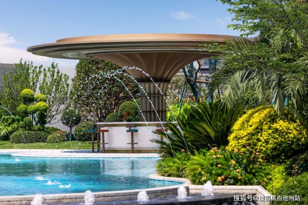 小区的园林景观一如既往延续了滨江的水准,中心区域设置了自然度假式的景观水池,配合棕榈等热带植物,结合着开放式酒廊和下沉卡座,整体度假氛围很不错。未来园区内还会设置童玩区等设施。