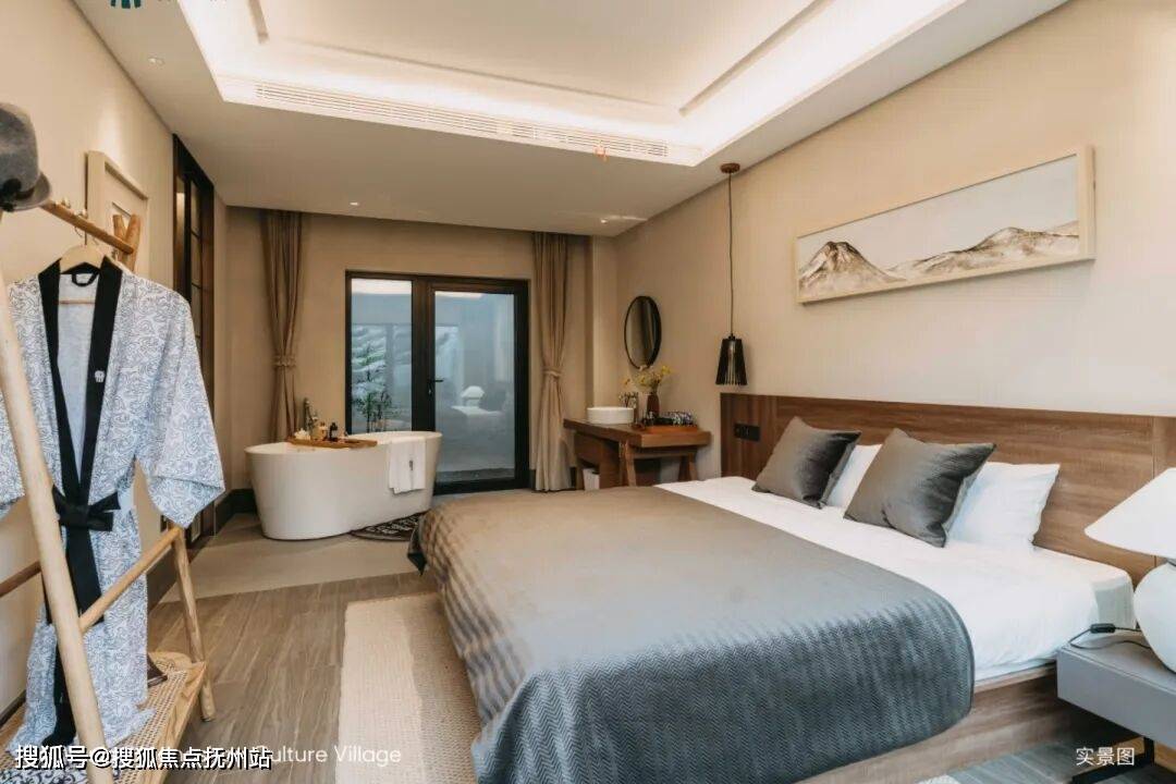 在联排和合院的套房主卧中,多分式盥洗间,配备浴缸区和淋浴区,全落地玻璃观景效果,让人仿佛酣睡于自然怀抱之中,安谧无虞。